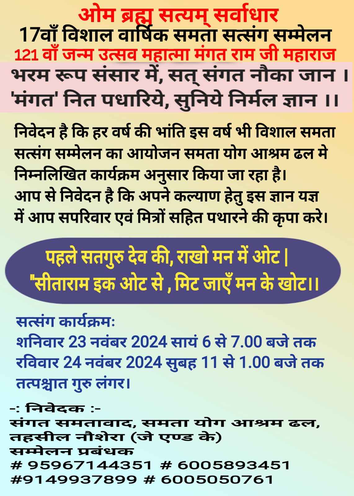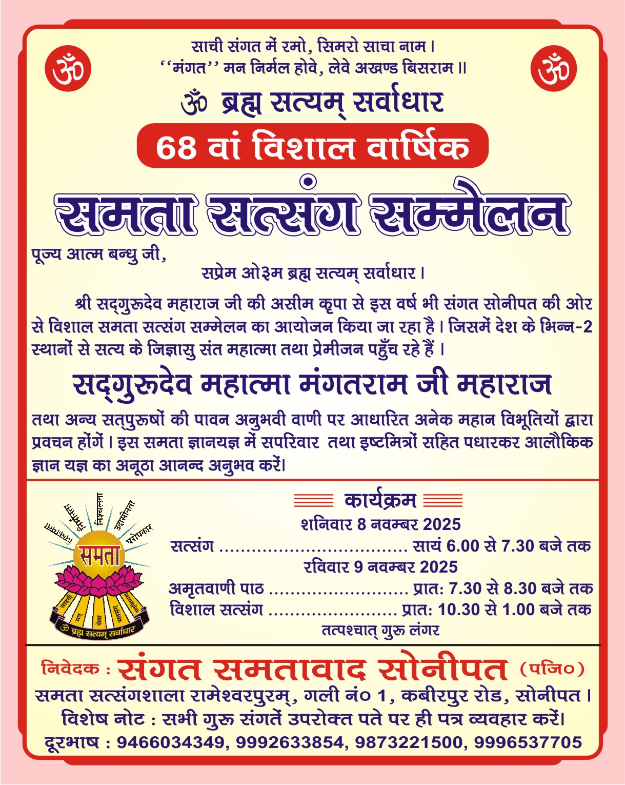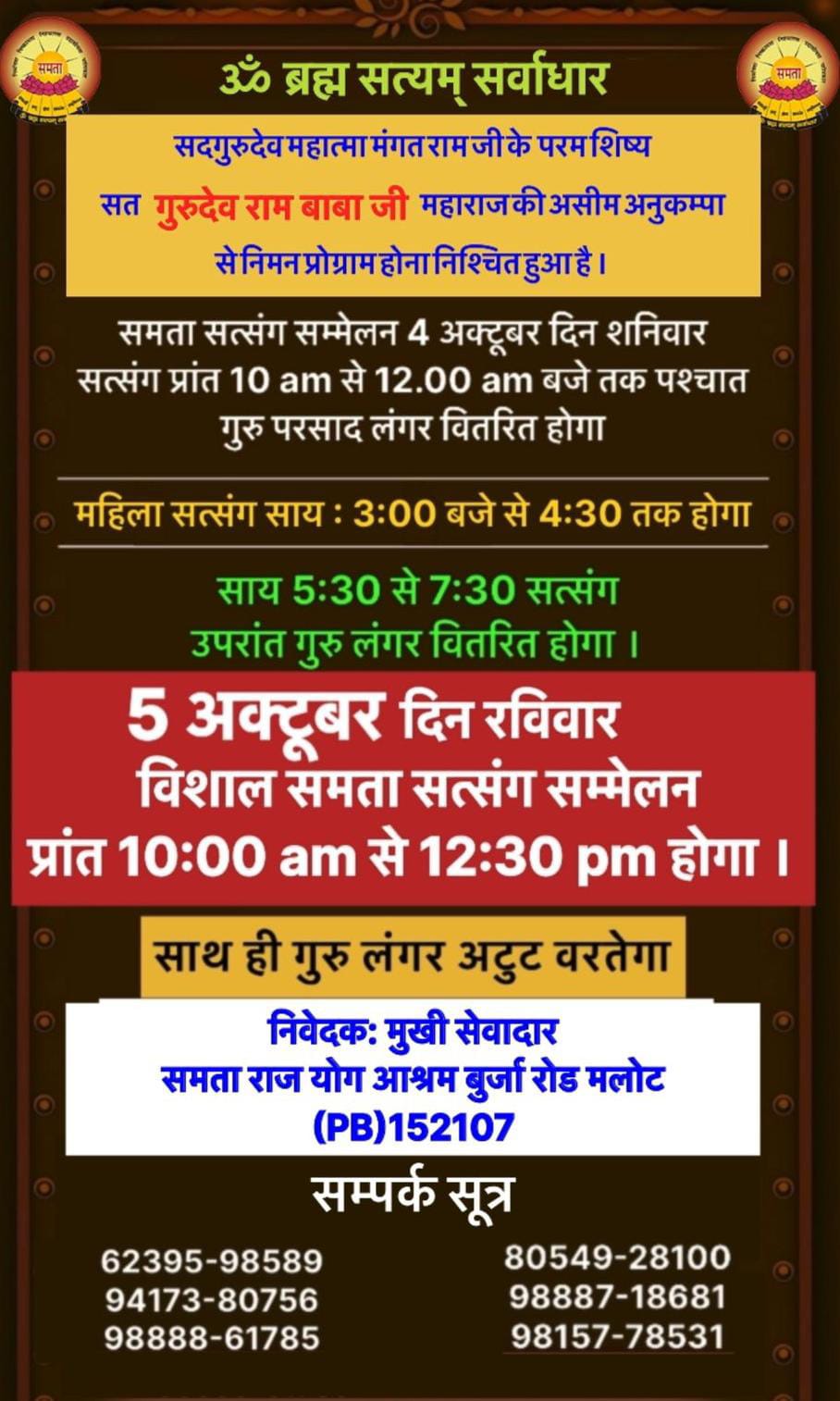 | 10 | Annual Satsang | 24-25-26 Oct 2025 | CARD | Samta Yog Ashram | Jagadhri | Haryana | India |