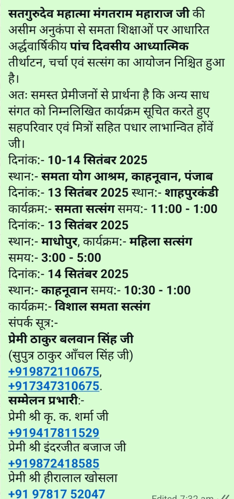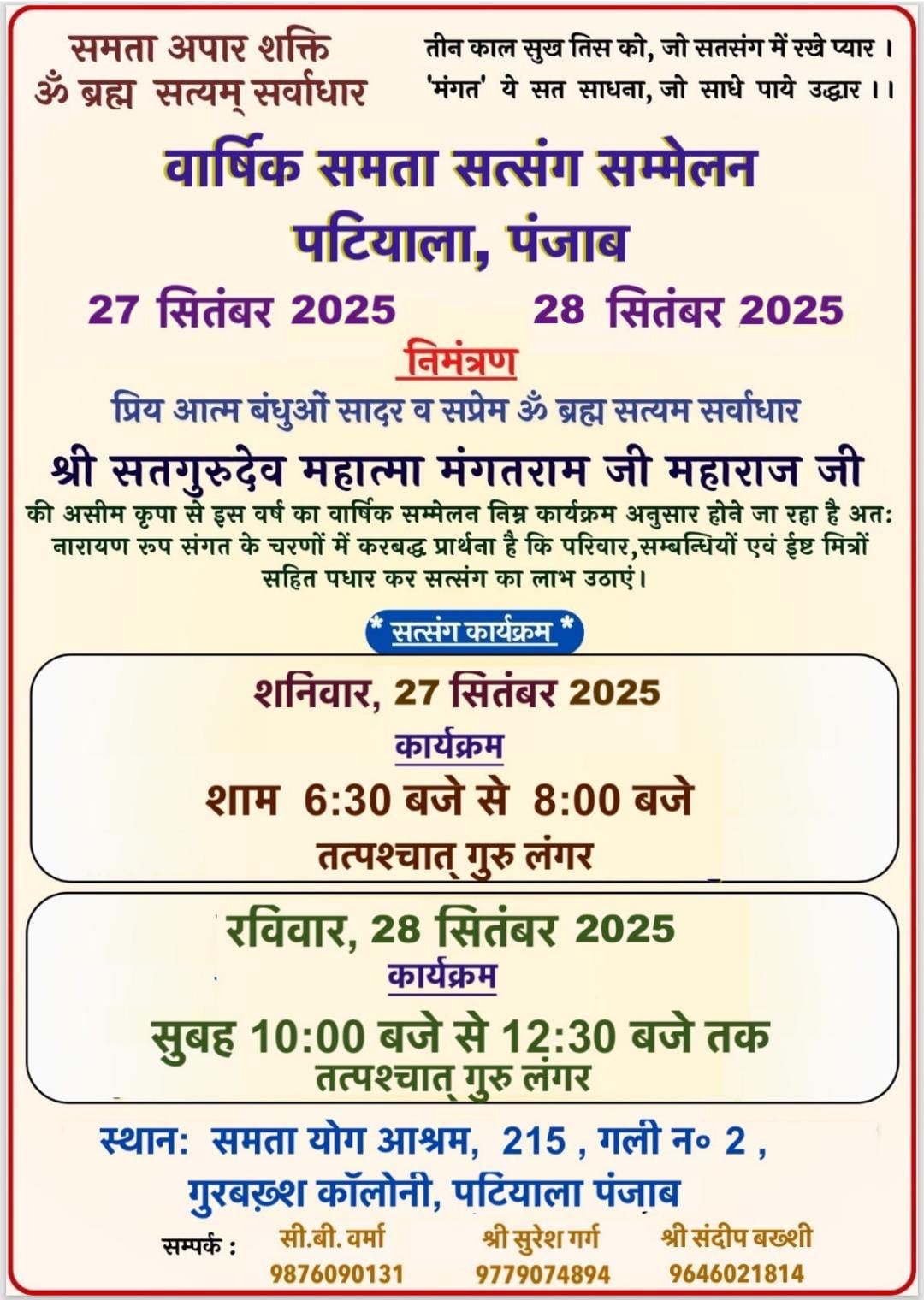 | 7 | Annual Satsang | 27-28 Sep 2025 | CARD | Samta Yog Ashram | Patiala | Punjab | India |