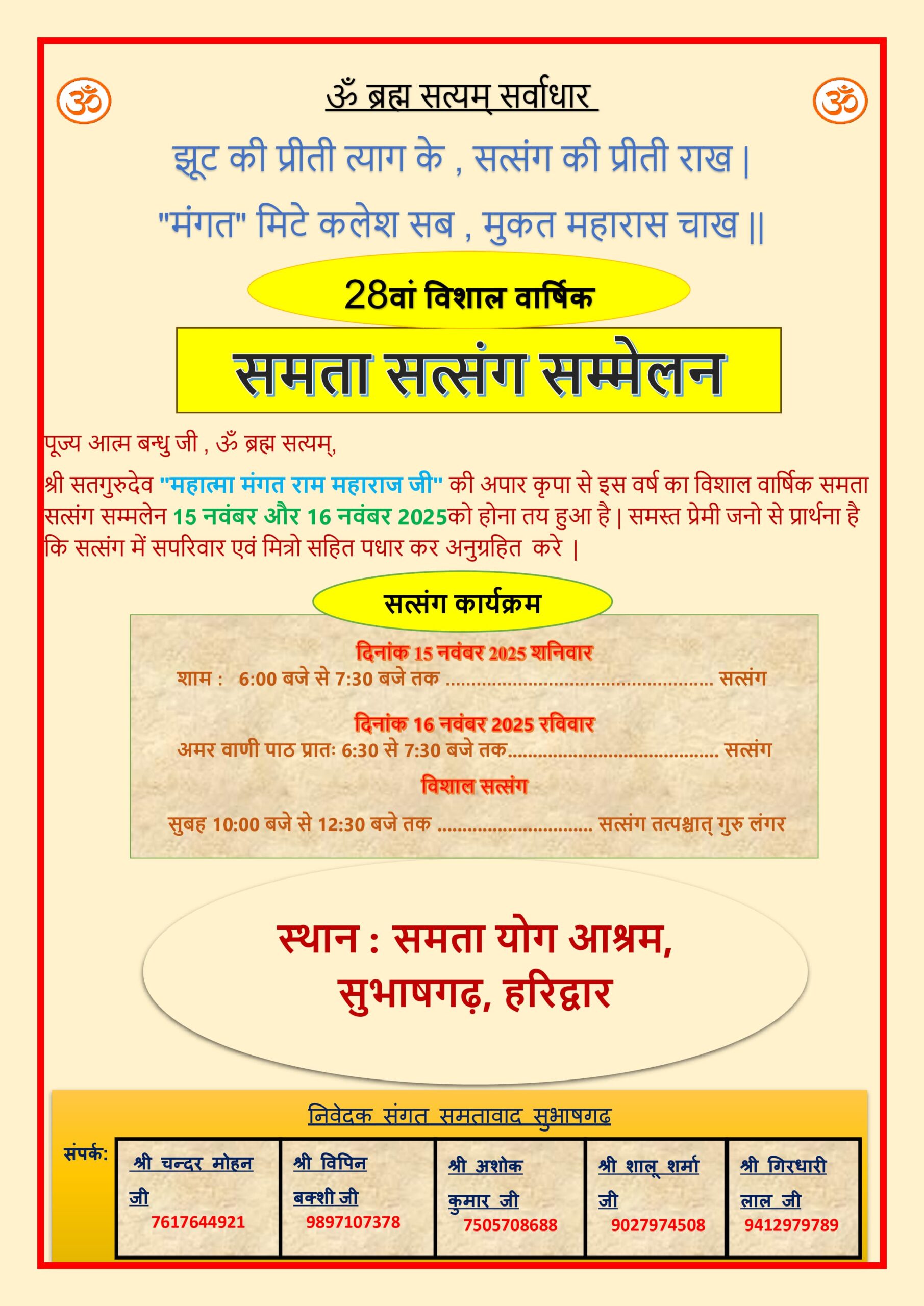 | 17 | Annual Satsang | 28-29 Nov 2025 | CARD | Samta Yog Ashram | Haldwani | Uttarakhand | India |