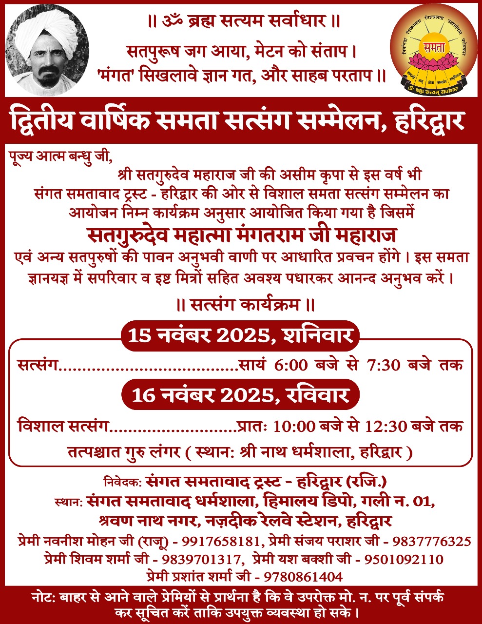 | 12 | Annual Satsang | 15-16 Nov 2025 | CARD | Sangat Samtvad Dharmshala | Haridwar | Uttarakhand | India |